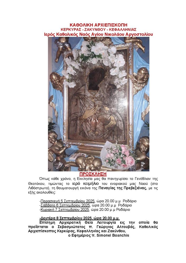 Η Καθολική Εκκλησία τιμά την Παναγία την Πρεβεζιάνα – To Πρόγραμμα στον Ι. Καθολικό Ναό Αγίου Νικολάου Αργοστολίου