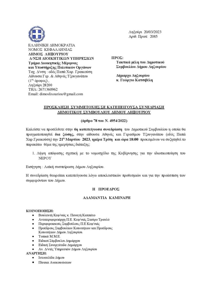 Στις 21/03 η 6η κατεπείγουσα συνεδρίαση Δημοτικού Συμβουλίου Δήμου Ληξουρίου για την ιδιωτικοποίηση του νερού
