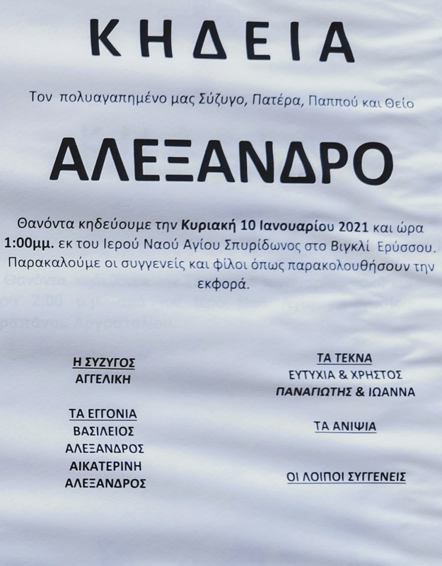 Κηδεία: Αλέξανδρος Παπαλεξάτος (Ιερέως Σπυρίδωνος) – Ετών 96