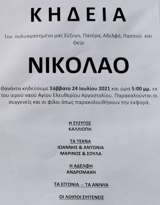 Κηδεία στο Αργοστόλι: Νικόλαος Καλαφάτης – Ετών 89