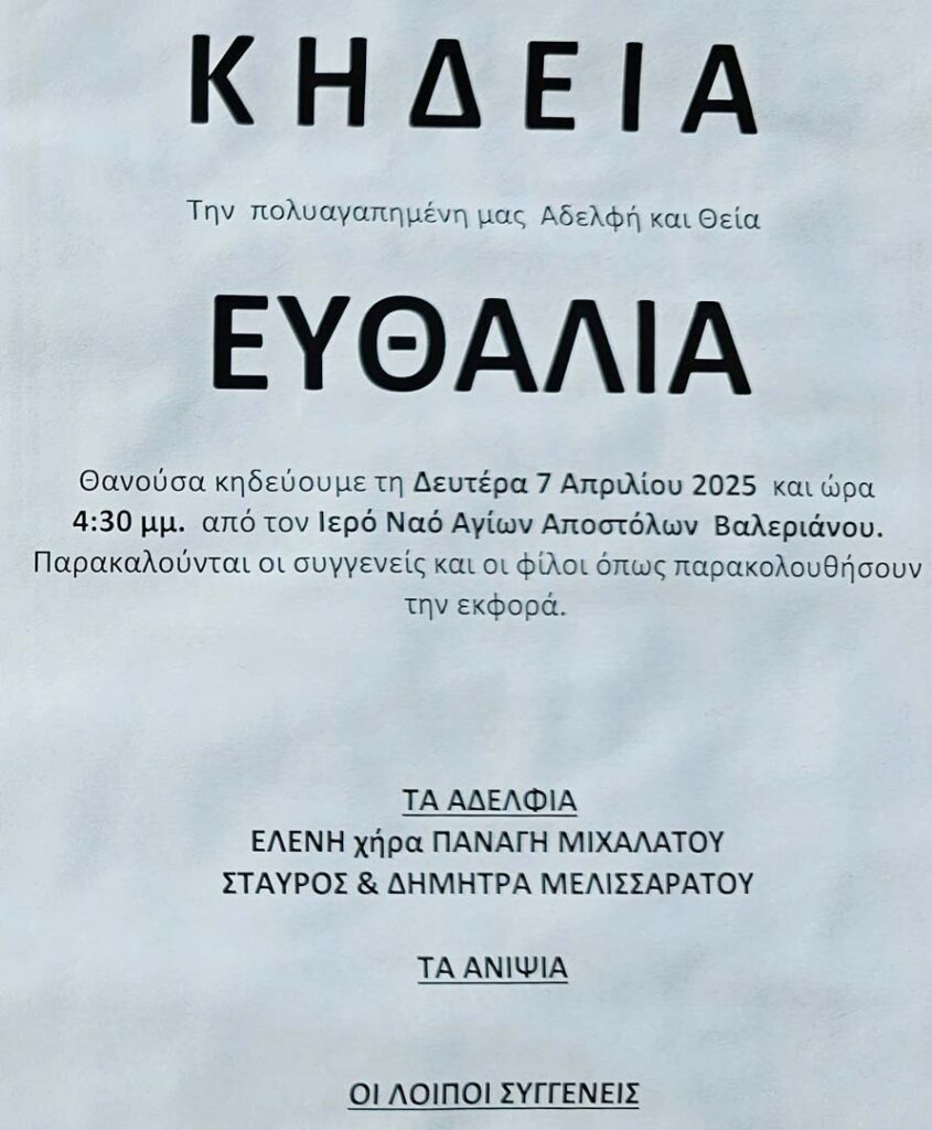 Έφυγε από τη ζωή η Ευθαλία Μελισσαράτου