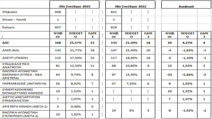 Η ΔΑΣ, που το ψηφοδέλτιό της συγκροτείται με συνδικαλιστές που συσπειρώνονται στο Π.Α.ΜΕ. με μεγάλη άνοδο σε ψήφους, ποσοστά και έδρες – από 134 ψήφους, 21,3% και 18 έδρες το 2022 σε 168 ψήφους, 22 έδρες και 25,57% – αναδείχθηκε πρώτη δύναμη γκρεμίζοντας την κυβερνητική παράταξη της ΔΑΚΕ από αυτή τη θέση.
