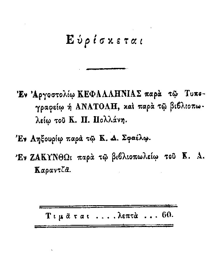 Το φυλλάδιο τω 32 σελίδων, κυκλοφόρησε στο νησί μας, όπου και στην τελευταία σελίδα αναφέρονται τα βιβλιοπωλεία που το προμήθευαν στον καθένα που το ήθελε.