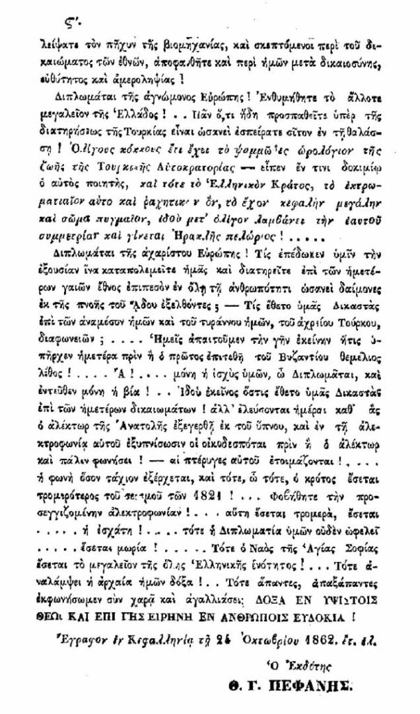 Στα 1862, απόρροια Διπλωματικών και Πολιτικών καταστάσεων πάνω στη μοίρα της Ελλάδας και η ιδέα της απελευθέρωσης των «Ενοικιασμένων Οικοπέδων μας», έκαναν κάποιες φωνές, που δεν υπολόγιζαν τον φόβο της επίκρισης και της κατάκρισης … και εξέδωσαν πονήματα που αφορούσαν την Πόλη και την ελπίδα της ελευθερίας των σκλαβωμένων πατρίδων. Πριν καλά – καλά γίνει η παράδοση των Επτανήσων στην Ελλάδα, ένας Κεφαλονίτης, ο Θεόδωρος Πεφάνης, φρόντισε να υπενθυμίσει την επιθυμία για λευτεριά της Πόλης, ιδίως να ενημερώσει πάνω στην ιστορία του περικαλλούς ναού της Αγίας του Θεού Σοφίας, της Κωνσταντινούπολης, καυτηριάζοντας στο πρόλογό του τα παιχνίδια της Ευρώπης, τα διπλωματικά –κόλπα- των ισχυρών, και τη βαρβαρότητα των Τούρκων. Ο πρόλογός του είναι επίκαιρος , «ωσάν των ημερών καθρέπτης» για την τύχη της Αγίας Σοφίας. Ας τον διαβάσει ο καθένας για να σχηματίσει τη δική του εικόνα πάνω στα σημερινά πολιτικά διεθνή συμφέροντα και τεκταινόμενα. Οι αλήθειες, που ο σπουδαίος Κεφαλονίτης λέει στον πρόλογό του, μας δείχνουν μέσα στα πολλά, πώς, … Έλληνες… μην αυταπατάστε, «- το μεγάλο πρόβλημα δεν είναι η Τουρκία- », το πρόβλημα είναι κάποια Ευρωπαϊκά κράτη, που θέλουν για τα δικά τους – δικά τους συμφέροντα, την ύπαρξη … πολεμικά …της Τουρκίας.