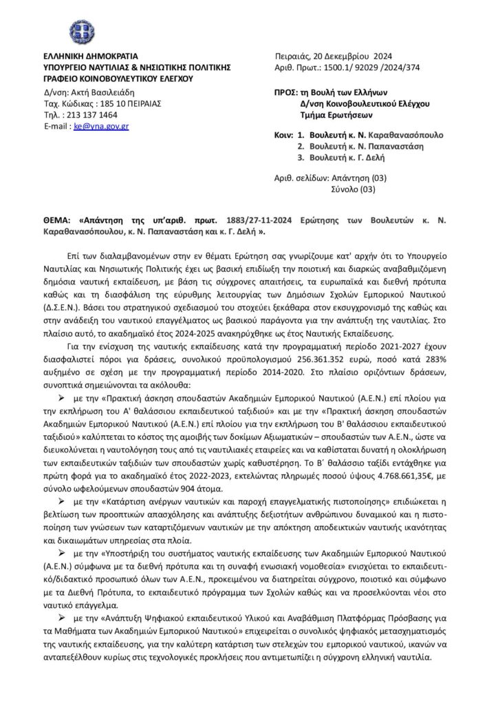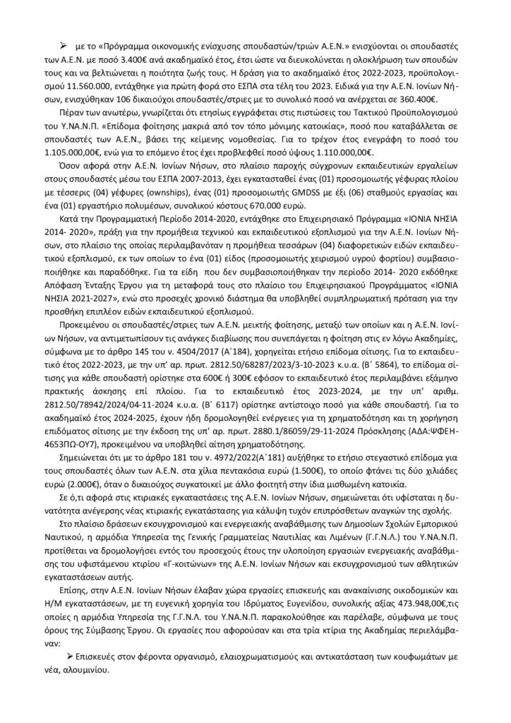 Απάντηση στην ερώτηση των Βουλευτών ΚΚΕ για την Ακαδημία Εμπορικού Ναυτικού Ιονίων Νήσων
