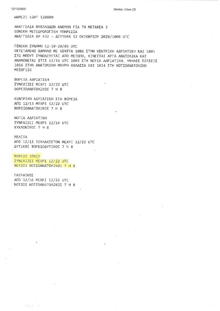 - Σε εκτέλεση ανωτέρω σχετικής αναμεταβιβάζεται συνημμένα το α.α : 432/12-10-2020 Αναγγελία Θυελλωδών ανέμων που αφορά θαλάσσια περιοχή δικαιοδοσίας μας και παρακαλούμε για την ενημέρωσή σας.