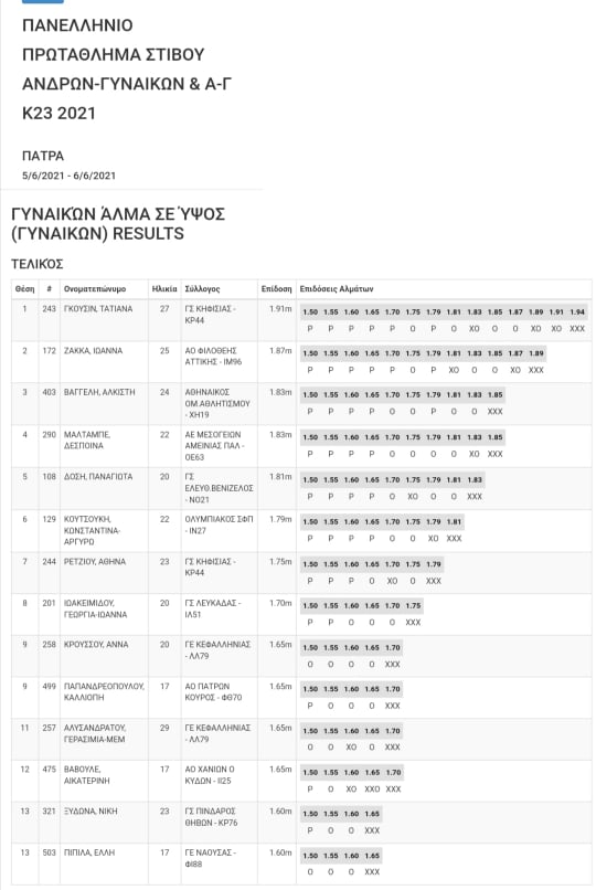 Νικήτρια στο αγώνισμα η Τατιάνα Γκούσιν της Κηφισιάς με 1.91, με 2η την Ιωάννα Ζάκκα με 1.87.