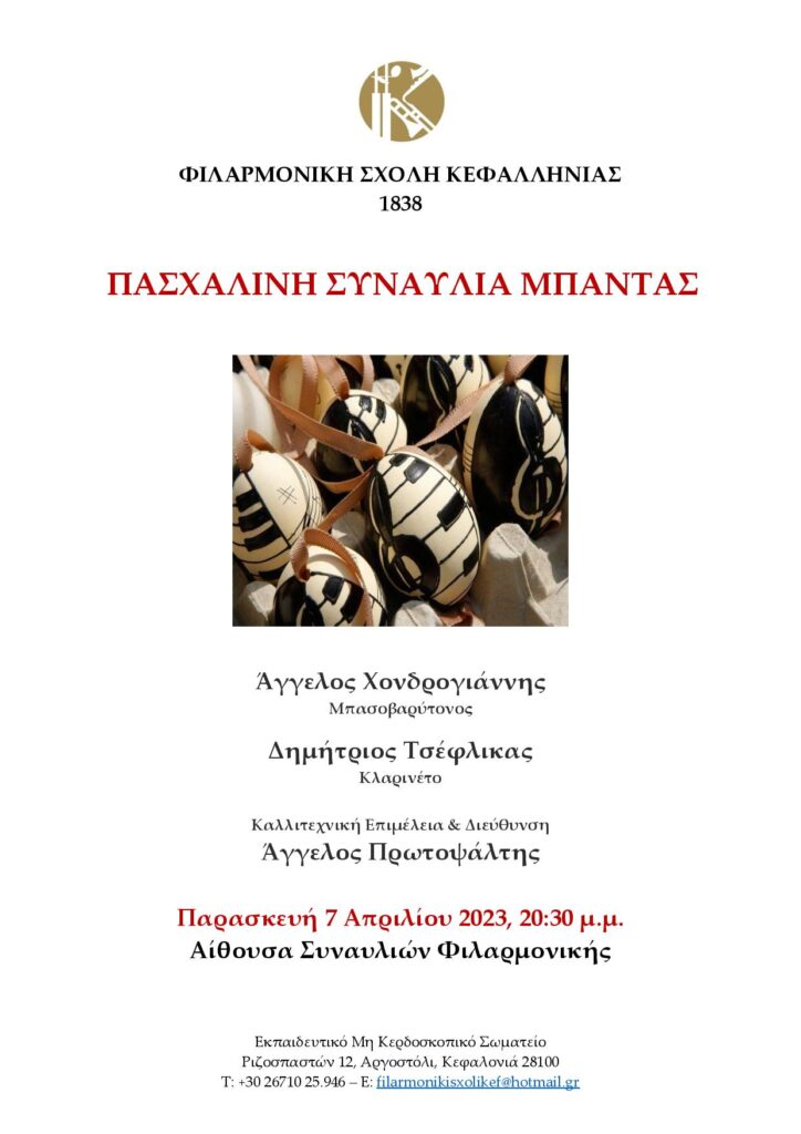 Η Φιλαρμονική Σχολή Κεφαλληνίας προσκαλεί όλους τους φιλόμουσους Κεφαλλονίτες Παρασκευή 7 Απριλίου, ώρα 8:30 μμ στην αίθουσα συναυλιών της, στην Πασχαλινή της συναυλία. Με την Μπάντα θα συνεργαστεί ο Μπασσοβαρύτονος Αγγελος Χονδρογιάννης που θα ερμηνεύσει έργα Offenbach και Verdi. Ο κλαρινετίστας μας Δημήτρης Τσέφλικας θα είναι ο σολίστ στην προσευxή του Αγ. Γρηγορίου του Hovhaness.
