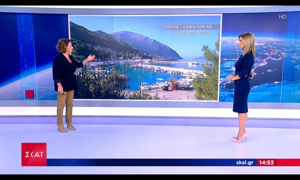 Ευχαριστούμε θερμά την αγαπητή και έγκυρη μετεωρολόγο του ΣΚΑΪ Χριστίνα Σούζη που νωρίτερα σήμερα στο δημοφιλές Μεσημβρινό Δελτίο Ειδήσεων του σταθμού με την Λένα Φλυτζάνη πρόβαλε στο πανελλήνιο τηλεοπτικό κοινό φωτογραφία μου από το γεμάτο σκάφη λιμάνι του Πόρου της Κεφαλονιάς μας!
