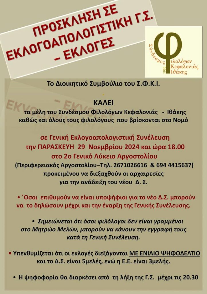 Πρόσκληση για την Τακτική Εκλογοαπολογιστική Συνέλευση και τις Εκλογές για την ανάδειξη του νέου Δ.Σ. του Συνδέσμου Φιλολόγων Κεφαλονιάς – Ιθάκης.