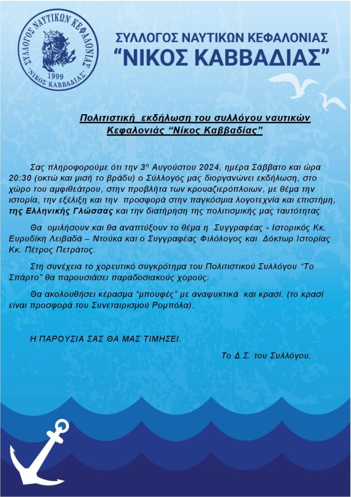 Σας πληροφορούμε ότι την 3η Αυγούστου 2024, ημέρα Σάββατο και ώρα 20:30 (οκτώ και μισή το βράδυ) ο Σύλλογός μας διοργανώνει εκδήλωση, στο χώρο του αμφιθεάτρου, στην προβλήτα των κρουαζιερόπλοιων, με θέμα την ιστορία, την εξέλιξη και την προσφορά στην παγκόσμια λογοτεχνία και επιστήμη, της Ελληνικής Γλώσσας και την διατήρηση της πολιτισμικής μας ταυτότητας