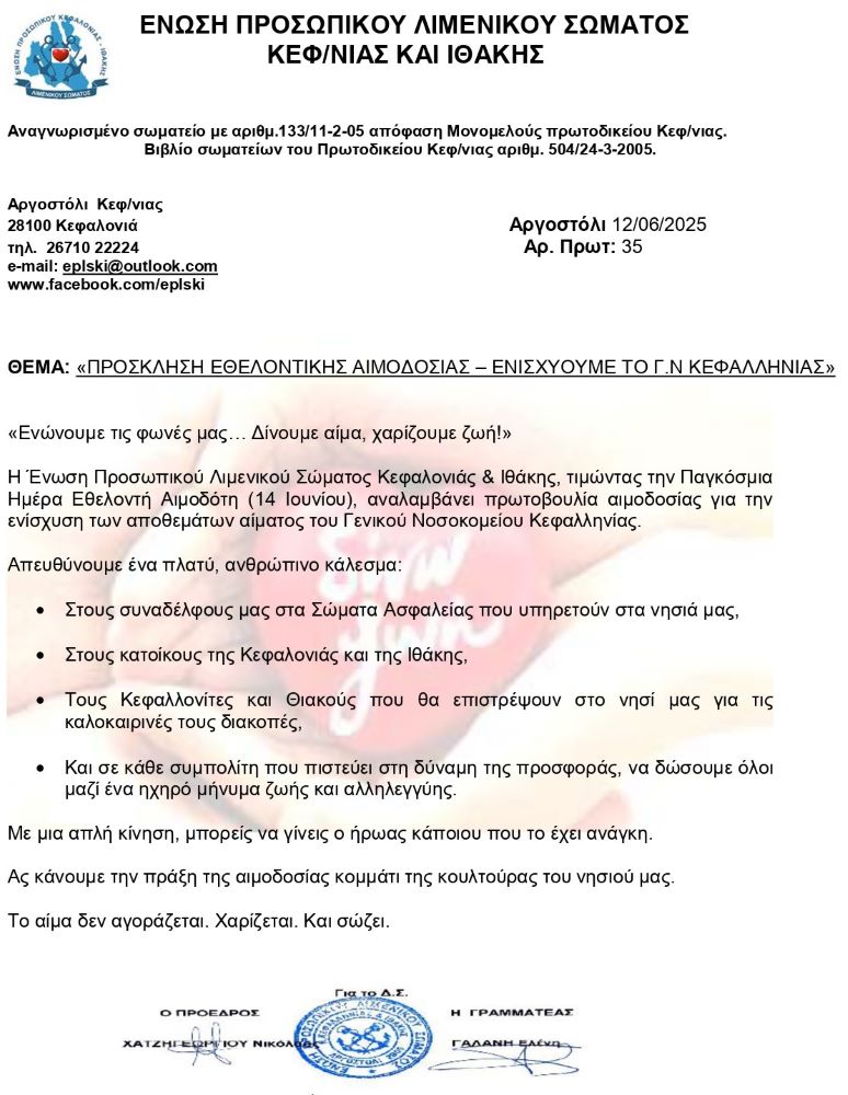 Εθελοντική Αιμοδοσία “Ενισχύουμε το Νοσοκομείο Κεφαλληνίας” από την Ένωση Λιμενικού Σώματος