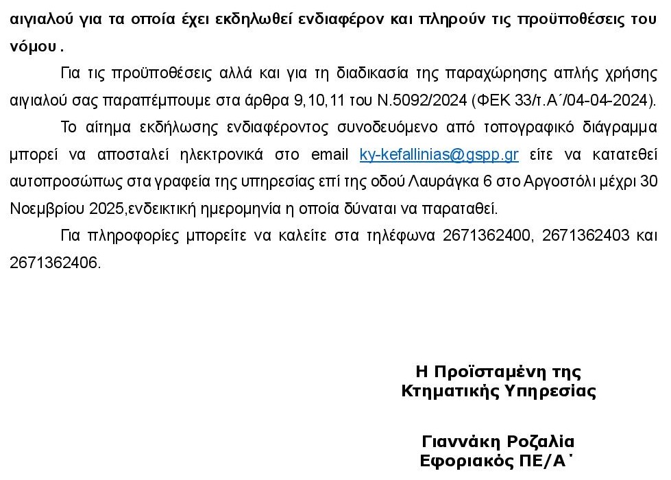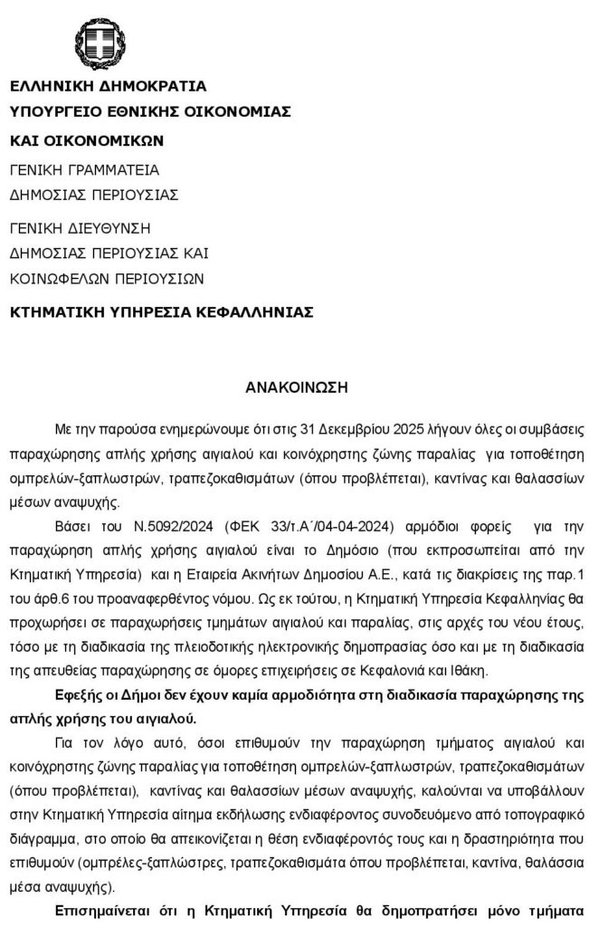 Κτηματική Υπηρεσία Κεφαλληνίας: Οι Δήμοι εφεξής δεν έχουν καμία αρμοδιότητα στη διαδικασία παραχώρησης απλής χρήση αιγιαλού