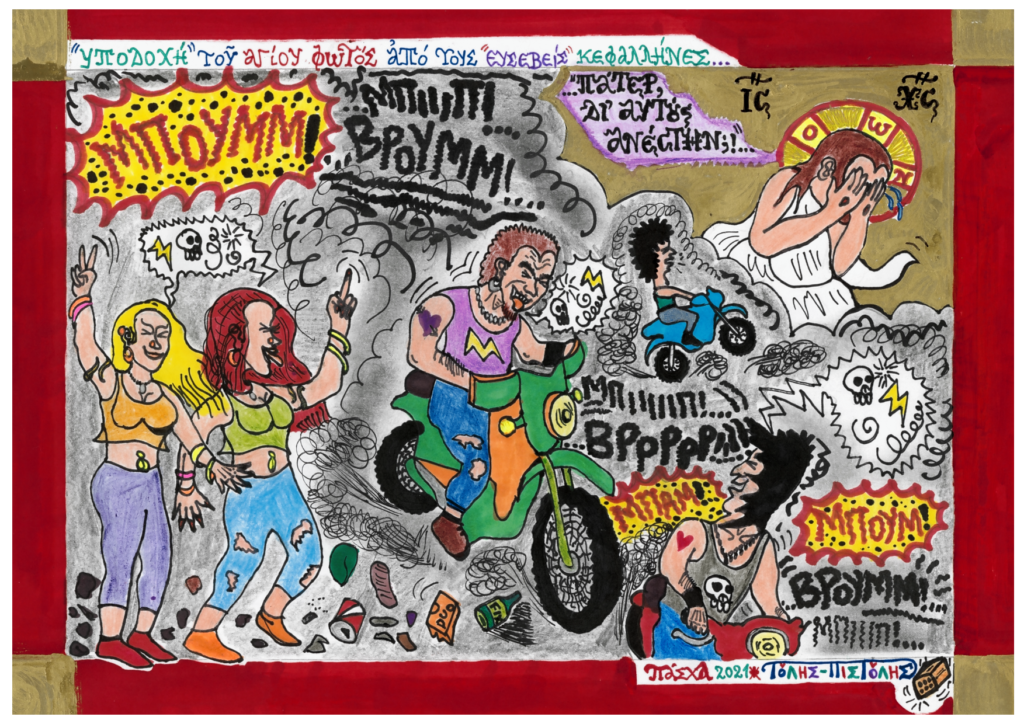 Εν προκειμένω, συγκεντρώνεται ένας μαινόμενος όχλος θερμόαιμων δικυκλιστών κάθε ηλικίας και κυβισμού, που επικαλούμενοι ένα ανυπόστατο «έθιμο», εξαπολύουν μία εκκωφαντική λαίλαπα ηχορρύπανσης χουλιγκανικού τύπου, που συγκλονίζει απ’ άκρης εις άκρην το Αργοστόλι (και όχι μόνο), ενώ περιλαμβάνει τα πάντα: δαιμονισμένα γκάζια, ακατάπαυστα κορναρίσματα, αλλεπάλληλες εκρήξεις κροτίδων προς πάσα κατεύθυνση, διασπορά απορριμμάτων, κραυγαλέες βωμολοχίες – ακόμη και βλασφημίες κατά των Θείων («κεφαλονίτες είμαστε – αλίμονο…»). Και όλα αυτά, εν ονόματι (υποτίθεται) του Αναστηθέντος Θεανθρώπου (!).