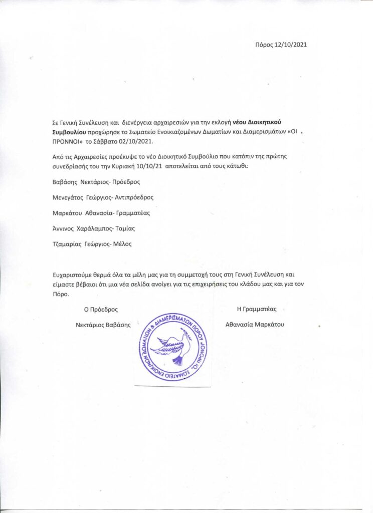 Νέο ΔΣ Σωματείου Ενοικιαζομένων Δωματίων & Διαμερισμάτων “ΟΙ ΠΡΟΝΝΟΙ”