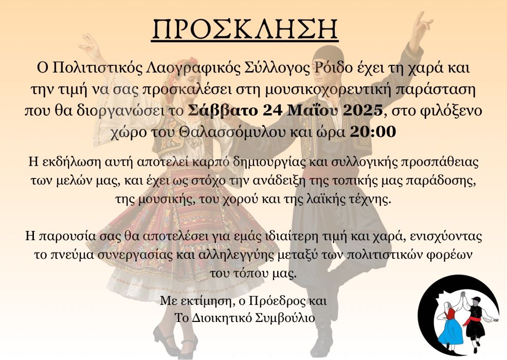 Στις 24/05/2025 μουσικοχορευτική παράσταση στο Θαλασσόμυλο από τον Σύλλογο “Ρόιδο”