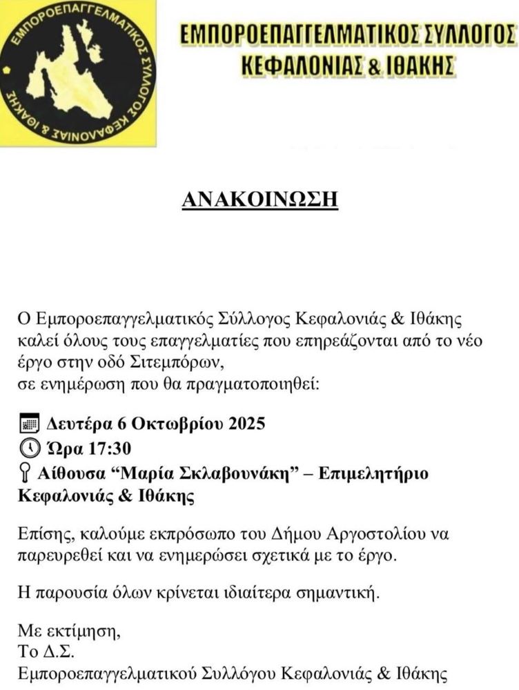 Ο Εμποροεπαγγελματικός Σύλλογος Κεφαλονιάς – Ιθάκης καλεί επαγγελματίες που επηρεάζονται από τα έργα στην οδό Σιτεμπόρων στο Αργοστόλι