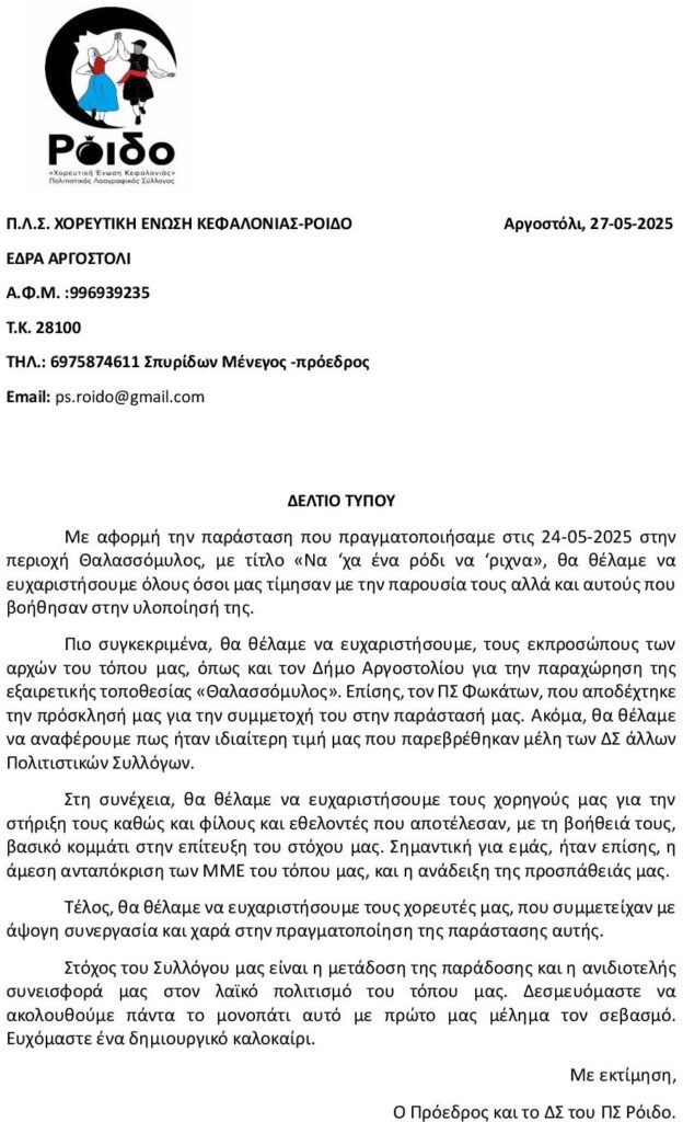 Ο Σύλλογος “Ρόιδο” ευχαριστεί όσους συνέβαλαν στην μουσικοχορευτική εκδήλωσή του