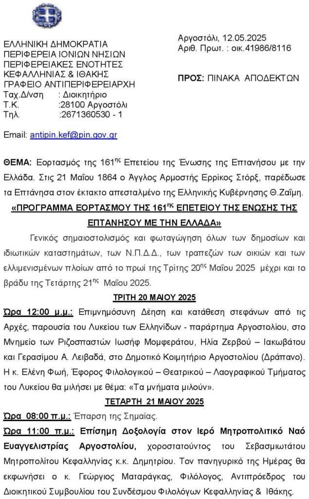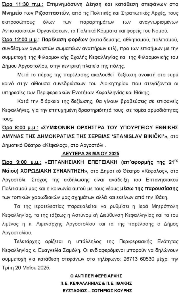 Σε συνέχεια του Αριθμ. Πρωτ.: οικ. 41986/8116/12.05.2025 Προγράμματος εορτασμού της Περιφερειακής Ενότητας Κεφαλληνίας, εν όψει της «161ης Επετείου της Ένωσης της Επτανήσου με την Ελλάδα», σας ενημερώνουμε ότι, η εκδήλωση της Συμφωνικής Ορχήστρας του Υπουργείου Εθνικής Άμυνας της Δημοκρατίας της Σερβίας “STANISLAV BINICKI”, θα πραγματοποιηθεί την Τετάρτη 21η Μαΐου 2025 και ώρα 9:00 μ.μ. στο Δημοτικό Θέατρο Αργοστολίου «Ο ΚΕΦΑΛΟΣ».