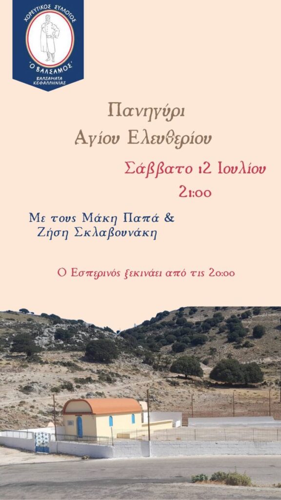 Ο Χορευτικός Όμιλος «Ο Βάλσαμος» σας προσκαλεί στο καθιερωμένο πανηγύρι στον Άγιο Ελευθέριο, στο βουνό του Αίνου, το Σάββατο 12 Ιουλίου 2025. Η βραδιά ξεκινά στις 21:00 με πλούσιο μπουφέ και ζωντανή μουσική από την ορχήστρα των Ζήση Σκλαβουνάκη και Μάκη Παπά.