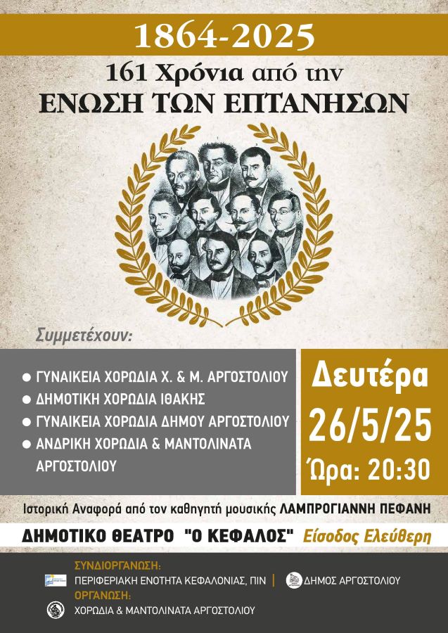 Οι Περιφερειακές Ενότητες Κεφαλονιάς και Ιθάκης της ΠΙΝ και ο Δήμος Αργοστολίου, έχουν την χαρά να σας προσκαλέσουν, την Δευτέρα 26 Μαΐου 2025, στο Δημοτικό Θέατρο Αργοστολίου ‘Ο ΚΕΦΑΛΟΣ’, στις 8:30 μμ., στην Επετειακή χορωδιακή εκδήλωση μνήμης και τιμής , με αφορμή τα :