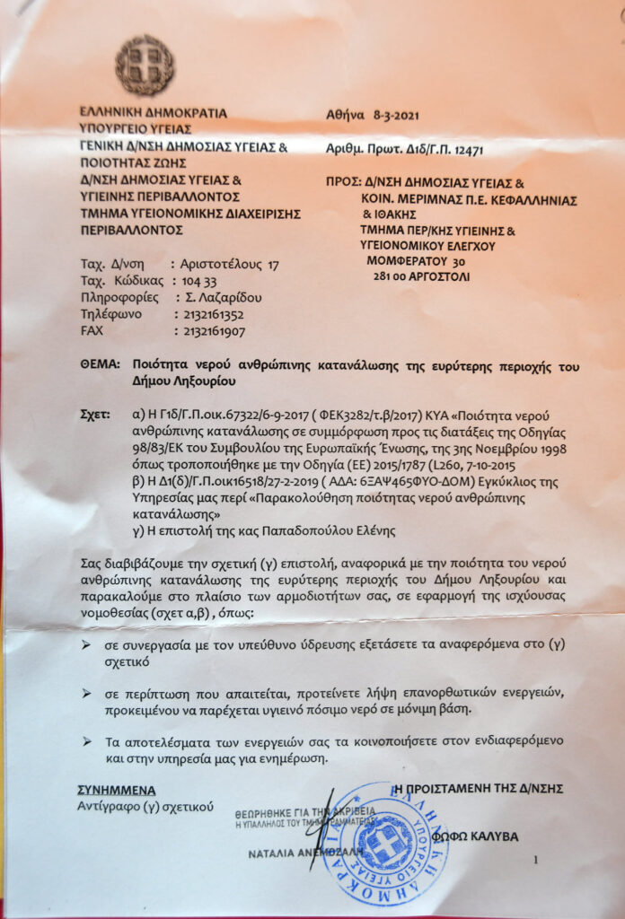 Απάντηση του Υπουργείου Υγείας σε κάτοικο για την ποιότητα του νερού στο Ληξούρι