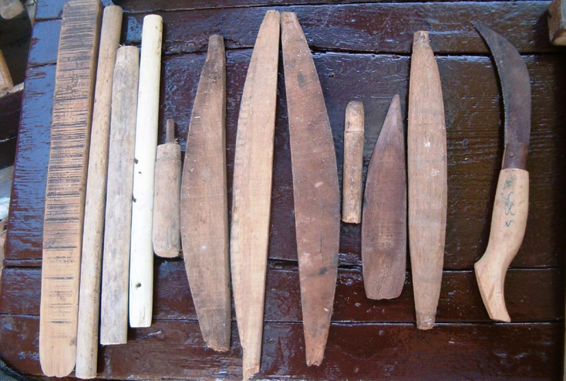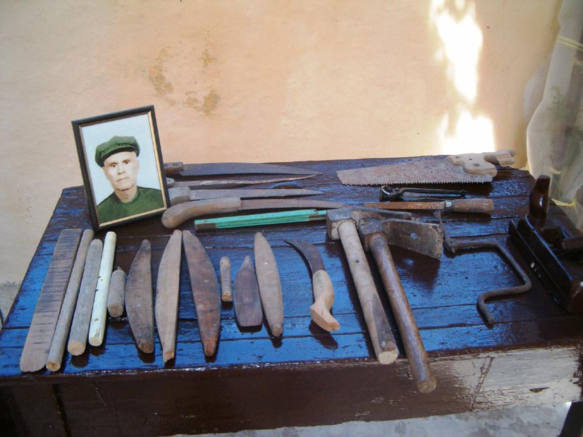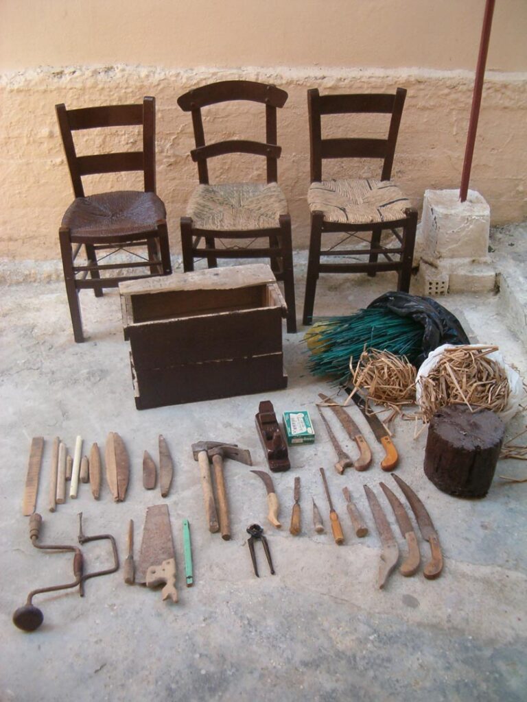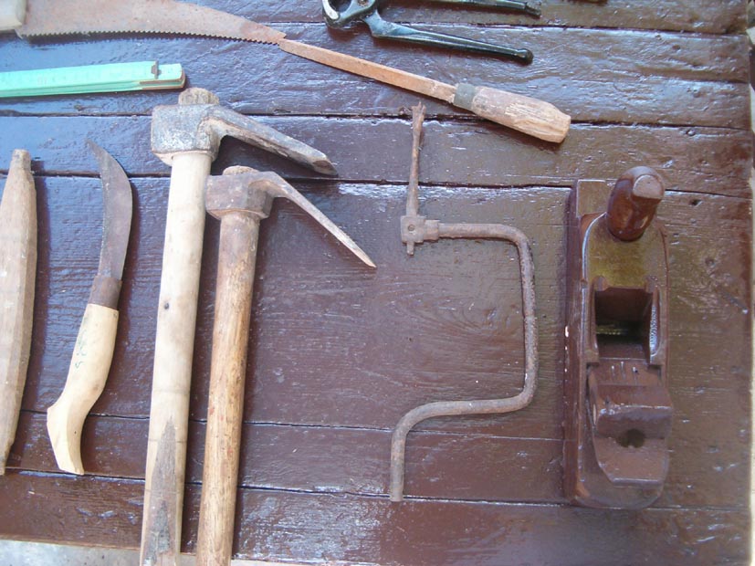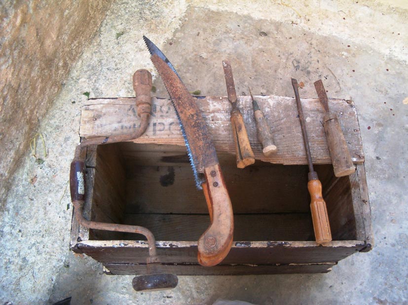 Σ’ ένα μεγάλο σακούλι κι  άλλες φορές σε μία ξύλινη μικρομεσαία κασέλα, είχε μαζεμένα τα εργαλεία του. Πλάνες, ράσπες, σύρμα, σκερπάνι, φαλτσέτα, λίμες, καρφιά και άλλα εργαλεία, απαραίτητα για τη δουλειά του.