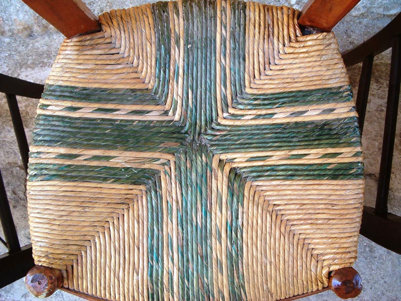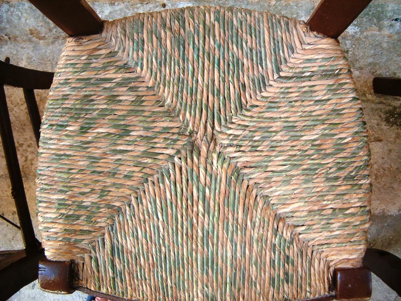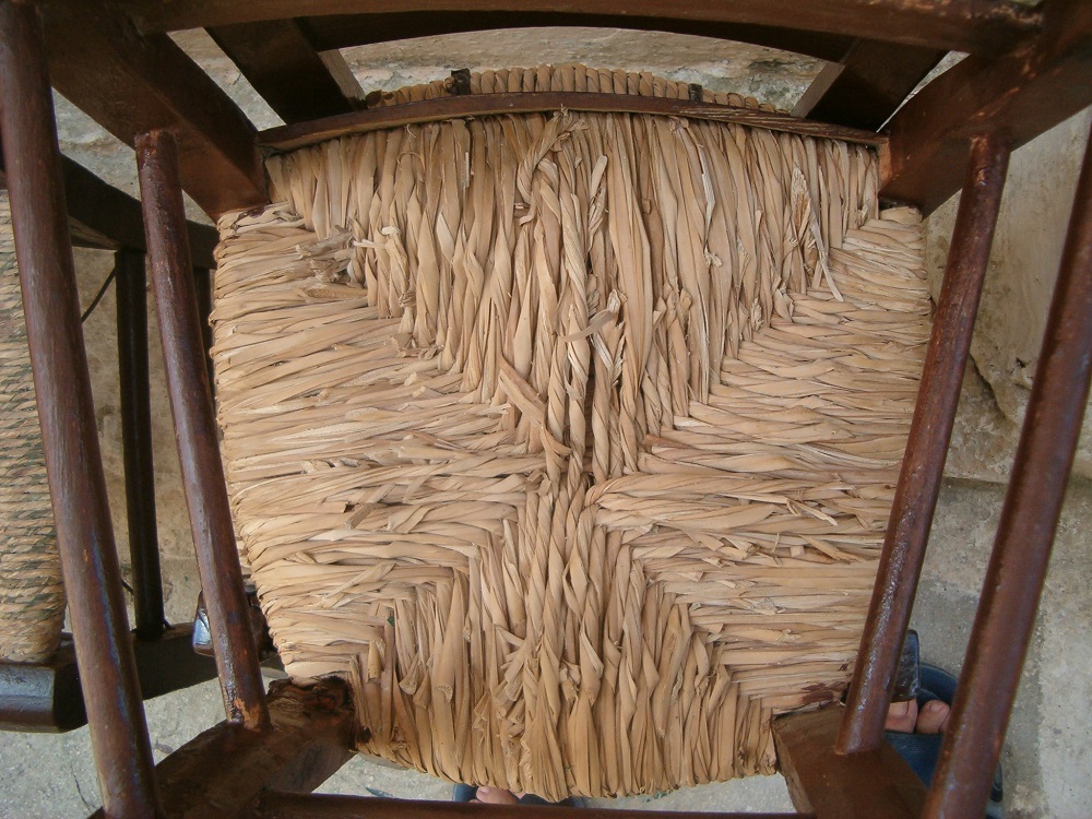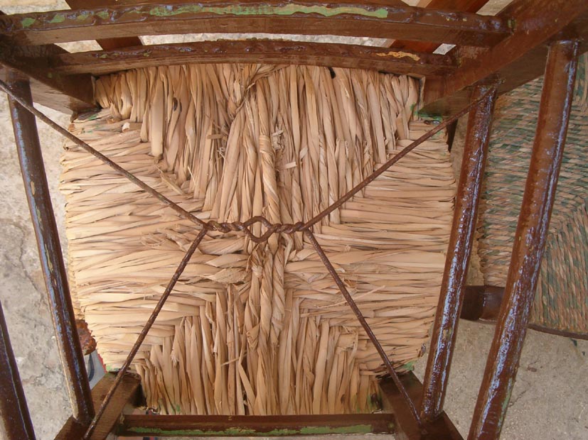 Το ψαθί όλο και το στριφογύριζε και  έτσι τροφοδοτούσε ο Γεράσιμος Μηνιάτης την ψάθινη τριχιά. Είχε πάντα το νου του να είναι καλά μουσκεμένο, για να έχει ευλυγισία και να δουλεύεται καλά. Το τροφοδοτούσε ανελλιπώς για να «δένει» καλά, κομμάτι – κομμάτι. Με τον τρόπο αυτόν, από τον πρώτο κόμπο το ψαθί ήταν ένα συνεχόμενο σκοινί. Πολλές φορές, εκεί που έστριβε το ψαθί, τύλιγε γύρω του μια λεπτή ψάθινη χρωματιστή ταινία για να κοσμήσει το κάθισμα. Θυμάμαι, ότι είχε και πολύχρωμες τέτοιες ταινίες, που ήταν νάιλον σωληνάκι και σωληνάκι πλακέ, καθώς και λεπτά μικρά βούρλα ή καλαμάκια, τα οποία χρησιμοποιούνταν για να διακοσμηθεί η καρέκλα.