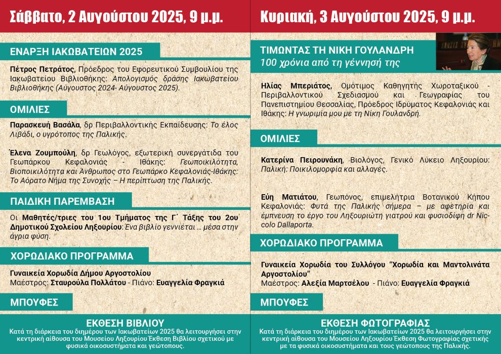 Θα πραγματοποιηθούν στον αύλειο χώρο του Μουσείου Ληξουρίου το Σάββατο, 2 Αυγούστου, και την Κυριακή, 3 Αυγούστου, και είναι αφιερωμένα στη Νίκη Γουλανδρή (1925-2019) – 100 χρόνια από τη γέννησή της 1925 – 2025.