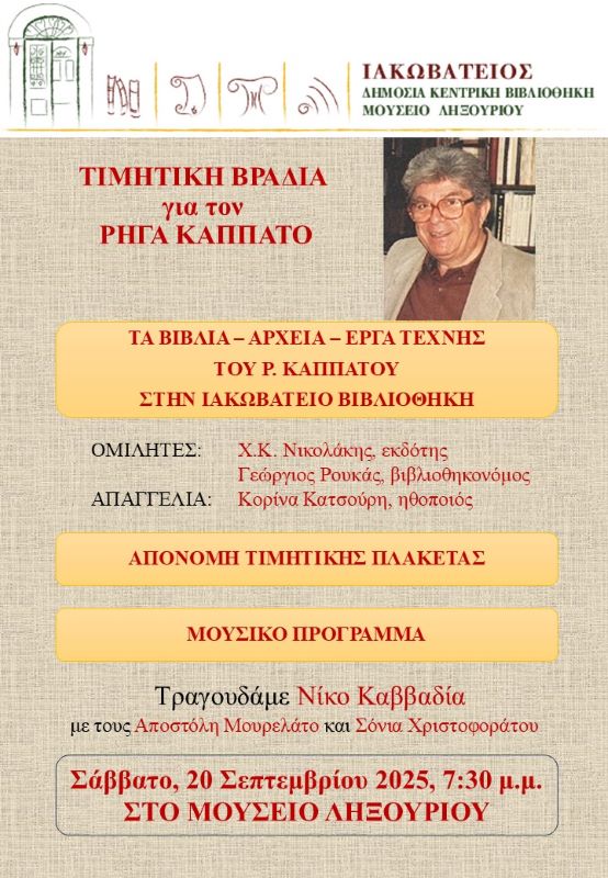 Η ΙΑΚΩΒΑΤΕΙΟΣ ΒΙΒΛΙΟΘΗΚΗ σας προσκαλεί στην εκδήλωση που διοργανώνει στο Μουσείο Ληξουρίου το Σάββατο, 20 Σεπτεμβρίου 2025, 7:30 μ.μ., προκειμένου να τιμήσει τον συμπατριώτη μας ποιητή, μεταφραστή και δοκιμιογράφο Ρήγα Καππάτο.