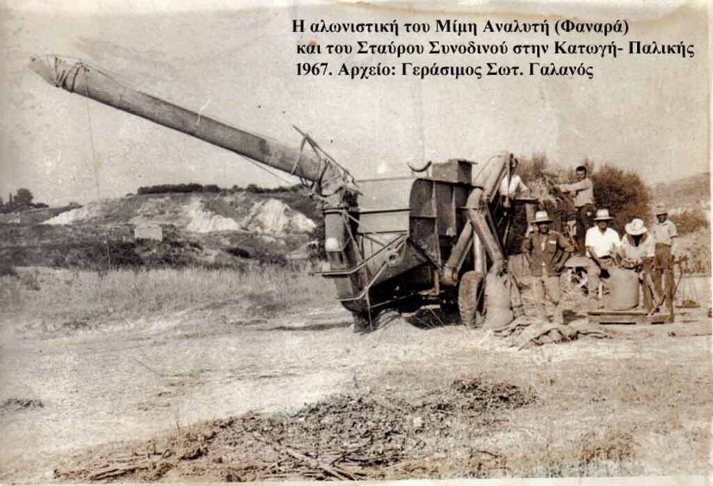 Το 1967 για ένα χρόνο, συνεργάστηκε με τον Δημήτρη Αναλυτή (Μίμη Φαναρά) και με αυτό το τρακτέρ κινούσαν τον ιμάντα της αλωνιστικής μηχανής και γύριζαν για το αλώνισμα πολλά μέρη του νησιού μας. Στην ίδια εργασία, την κίνηση της αλωνιστικής, την έκαμε και με τον Νικόλαο Αλισανδράτο(Φλούδα) για δύο χρόνια.