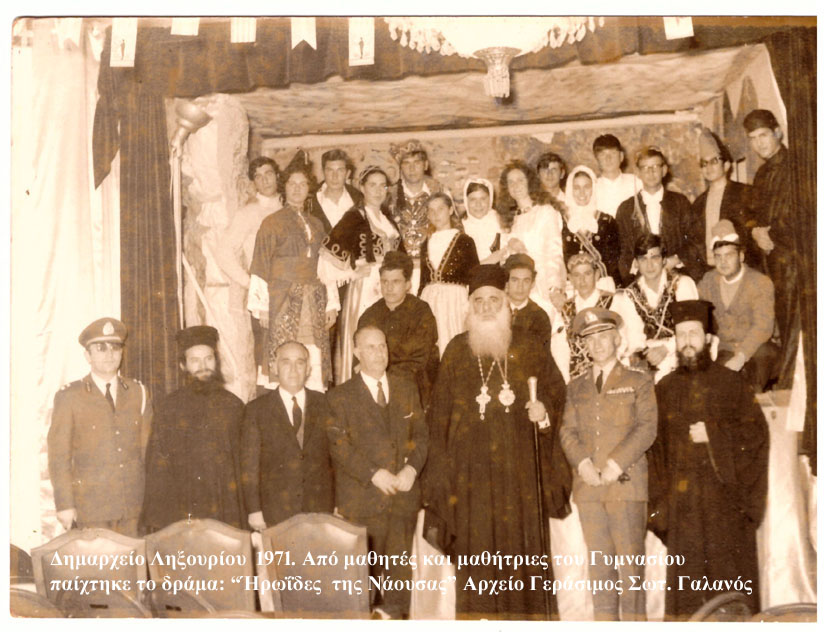 Αφορά το δράμα, «Ηρωίδες της Ναούσης» που παίχτηκε με πολλή επιτυχία από τους μαθητές και μαθήτριες. Η φωτογραφία δείχνει τον τότε μητροπολίτη Κεφαλληνίας, μακαριστό Προκόπη Α΄, τον επίσης μετέπειτα μητροπολίτη Παραμυθίας, Τίτο, που το διάστημα εκείνο ήταν ιεροκήρυκας της μητρόπολης μας και τον τότε πρωτοσύγκελο, Κωνσταντίνο Γκέλη. Πέρα από τους ιερωμένους, διακρίνονται άτομα της στρατιωτικής και αστυνομικής εξουσίας του Ληξουρίου, καθώς και : Ο γυμνασιάρχης Αριστείδης Γραικούσης και ο τότε δήμαρχος Χαράλαμπος Σφαέλος.