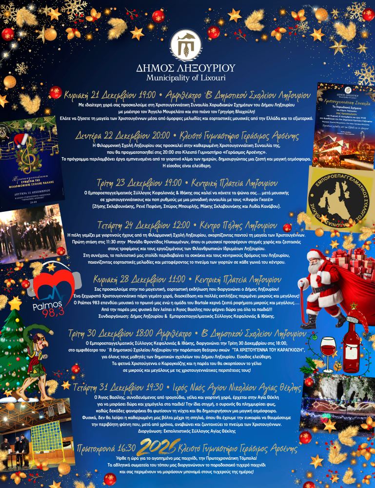 Μόλις μας στάλθηκε σήμερα Τρίτη 23/12/2025 το πρόγραμμα των εορταστικών εκδηλώσεων στον Δήμο Ληξουρίου από 21/12 έως και 01/01/2026… Ήρθε με “μικρή” καθυστέρηση σε εμάς, αλλά ήρθε…