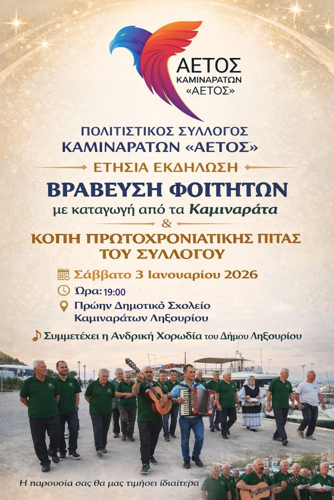 Βράβευση φοιτητών με καταγωγή από τα Καμιναράτα Κεφαλονιάς από τον Σύλλογο “Αετός Καμιναράτων” στις 03/01/2026