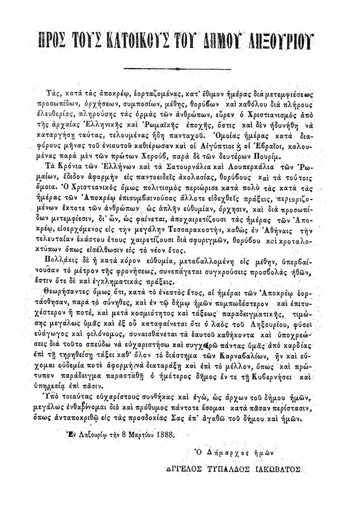 Υπάρχουν ιστορικές αναφορές για όλη αυτή τη διονυσιακή αποκριά στη Χωροπούλα του Λασκαράτου, με βασική αυτή: το μονόφυλλο του τότε Δημάρχου, Άγγελου Τυπάλδου Ιακωβάτου, ο οποίος γνωρίζοντας πως το καρναβάλι στο Ληξούρι έχει οργιαστικό μπρίο και ακράτητο κέφι, έκδωσε ένα μονόφυλλο στα 1888, για να προλάβει τους Ληξουριώτες, να περιορίσουν τα έντονο καρναβαλικό ταρνανάι και να μην κάνουν ζημιές και καταστροφές στην πόλη τους, πάνω στα ρωμαϊκά ξεφαντώματα της αποκριάς τους, που τα είχαν από παράδοση αιώνων.