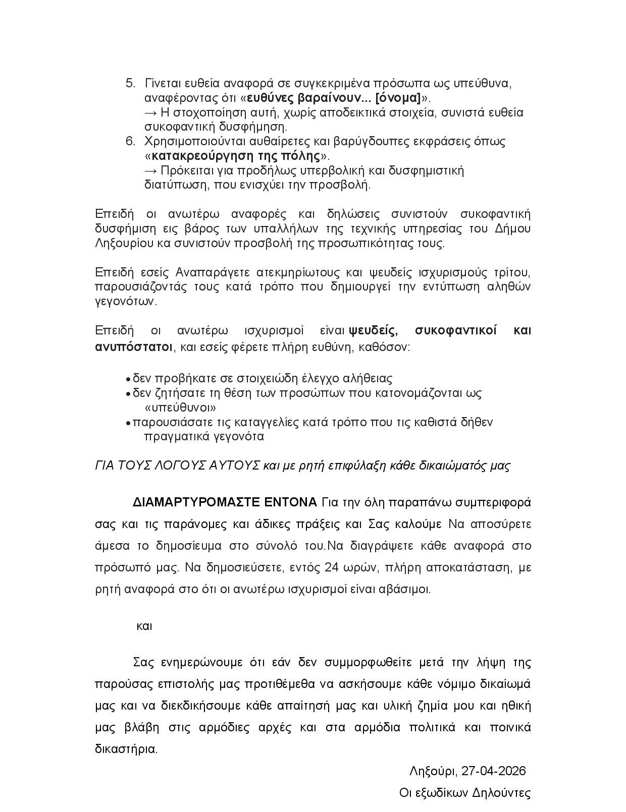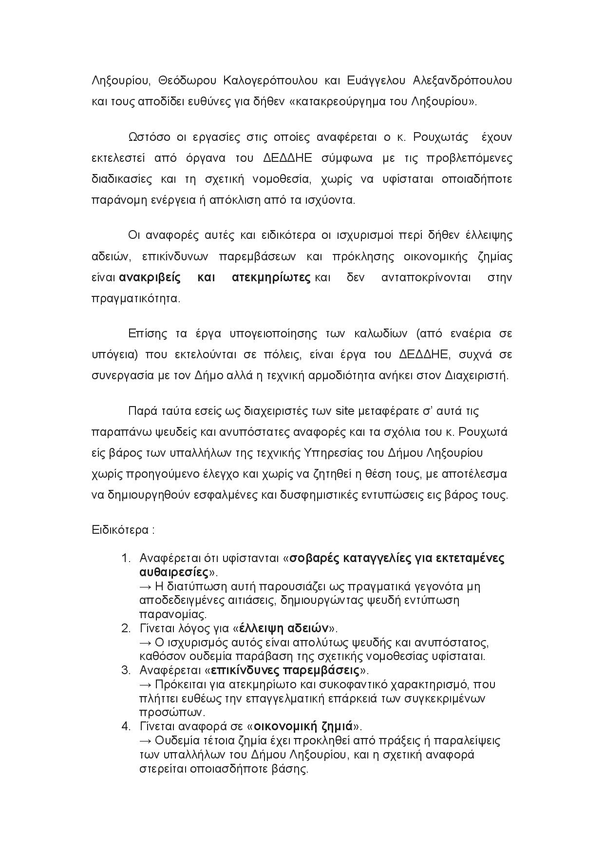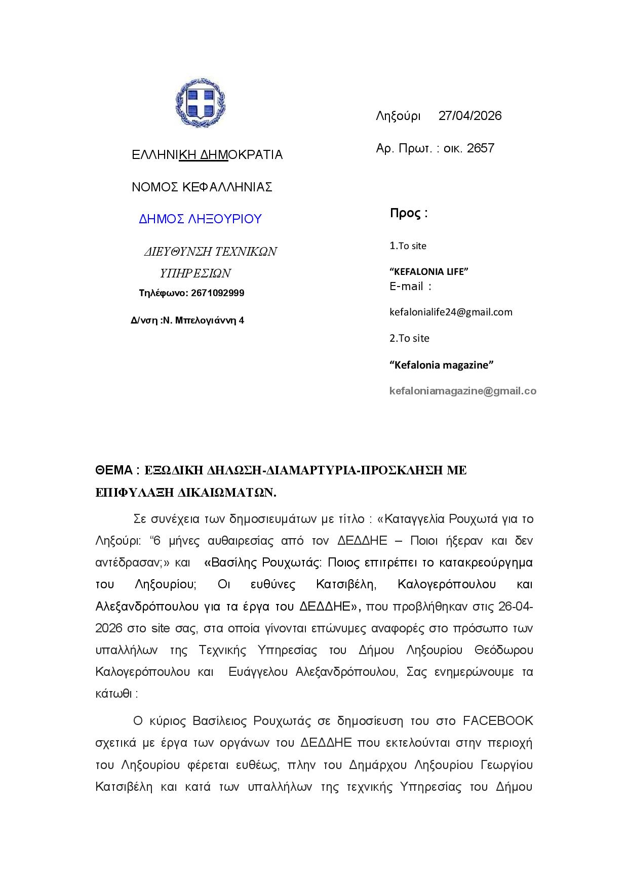 Προβάλλουμε παρακάτω την εξώδικη δήλωση – διαμαρτυρία δύο υπαλλήλων της Τεχνικής Υπηρεσίας του Δήμου Ληξουρίου, όπως ακριβώς μας αποστάλθηκε πριν λίγο ως απάντηση στη χθεσινή ανάρτηση του πρώην Δημάρχου Ληξουρίου Βασίλη Ρουχωτά για τα έργα του ΔΕΔΔΗΕ.