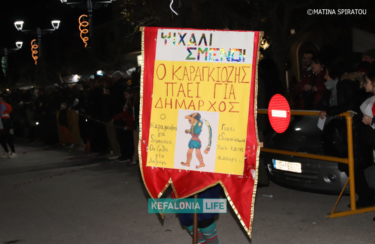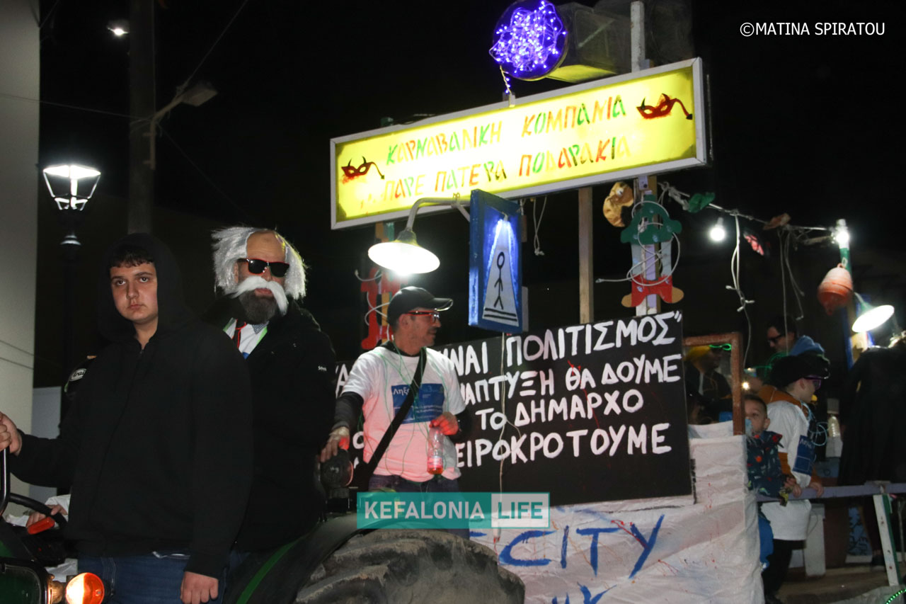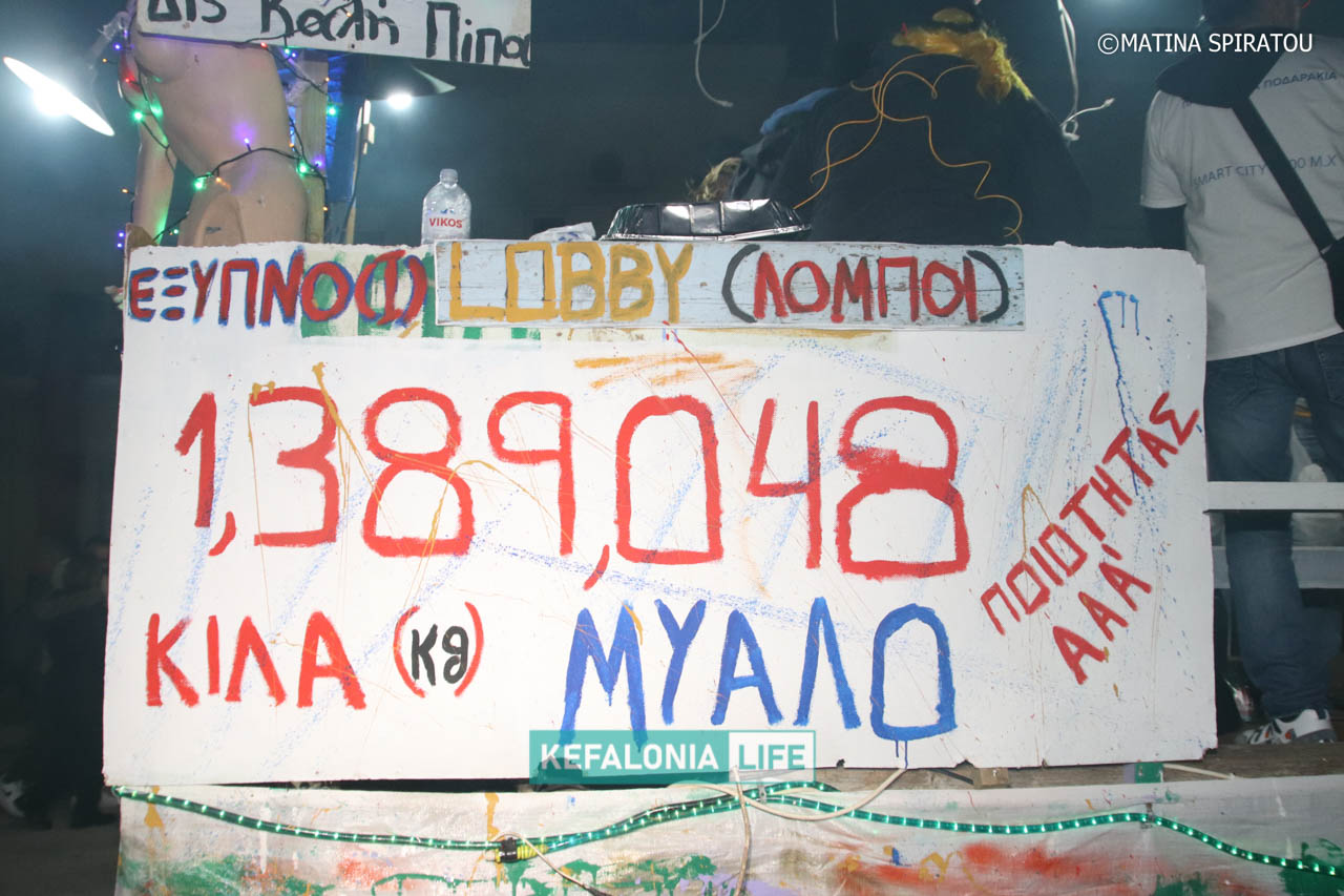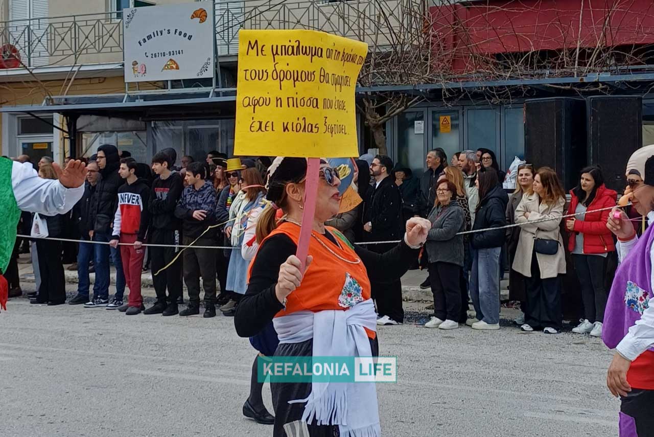 Η παρέλαση ξεχώρισε όχι μόνο για τον παλμό και τη μαζική συμμετοχή, αλλά κυρίως για τον έντονα σατιρικό της χαρακτήρα. Πολλά άρματα και καρναβαλικές ομάδες εστίασαν στον Δήμαρχο και στις πρόσφατες αποφάσεις της Δημοτικής του Αρχής. Ευρηματικά στιχάκια και λεζάντες έκαναν το κοινό να δακρύσει από τα γέλια γνωρίζοντας την πραγματική κατάσταση της πόλης και την οικονομική κατάσταση του Δήμου Ληξουρίου.