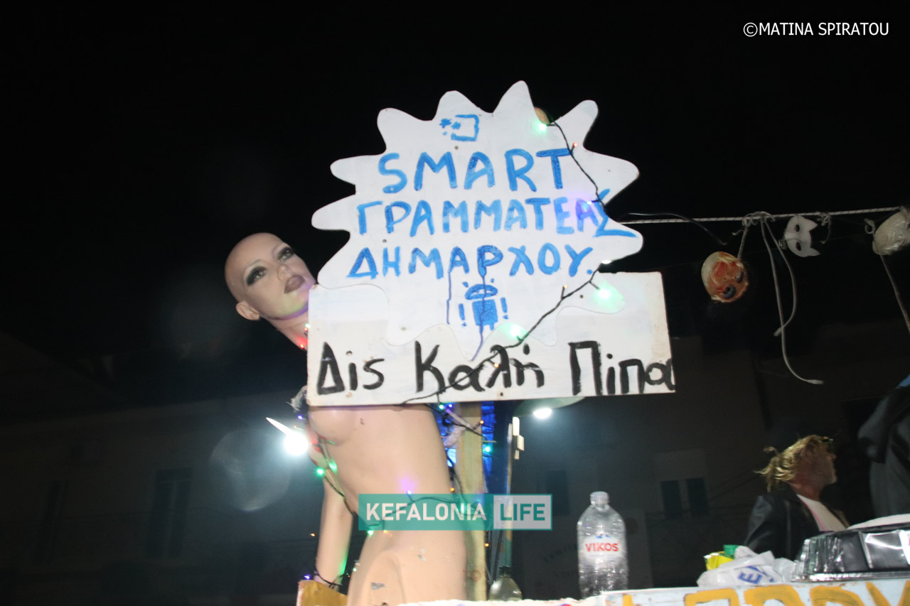 Κεντρικό θέμα της σάτιρας αποτέλεσαν το πολυσυζητημένο πρόγραμμα «Smart City», οι «έξυπνες» διαβάσεις πεζών, τα «έξυπνα» παγκάκια και γενικότερα, κατά γενική ομολογία, τα αχρείαστα και πανάκριβα smart συστήματα που εγκαταστάθηκαν, αξίας 1 εκ. ευρώ. Το θέμα σατιρίστηκε από το γκρουπ “Πάρε πατέρα ποδαράκια”. Ακόμη, στο ζήτημα της Κρουαζιέρας στο Ληξούρι αναφέρθηκε ο Σύλλογος Αετός Καμιναράτων μαζί με τα Μαρτσελάτα – Λεγατάτα. Αρκετοί συμμετέχοντες απέδωσαν με χιουμοριστική, αλλά αιχμηρή διάθεση την αντίδραση μερίδας κατοίκων, οι οποίοι αντιμετωπίζουν αυτές τις πρωτοβουλίες ως «φάρσα» και ως σπατάλη δημόσιων πόρων. Να σημειώσουμε ότι για την υπόθεση της κρουαζιέρας μετά από απόφαση της Δημοτικής Αρχής διατέθηκε το ποσό των 37.200 ευρώ σε εταιρεία προώθησης από την Κρήτη.