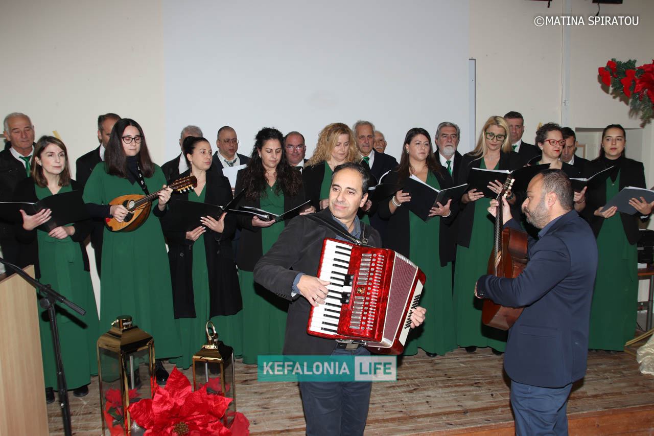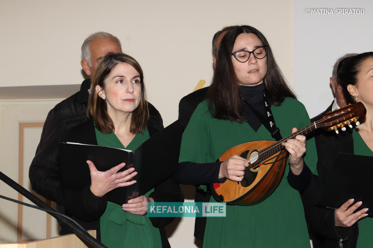 Η εκδήλωση πλαισιώθηκε και έκλεισε μουσικά με την Ανδρική και Γυναικεία Χορωδία του Δήμου Ληξουρίου υπό τη διεύθυνση του μαέστρου Άγγελου Μουρελάτου, με συνοδεία στο πιάνο από τον Γρηγόρη Βλαχούλη, που μελωδικά ερμήνευσαν αγαπημένα τραγούδια που γέμισαν την αίθουσα με μελωδίες γεμάτες αισιοδοξία.