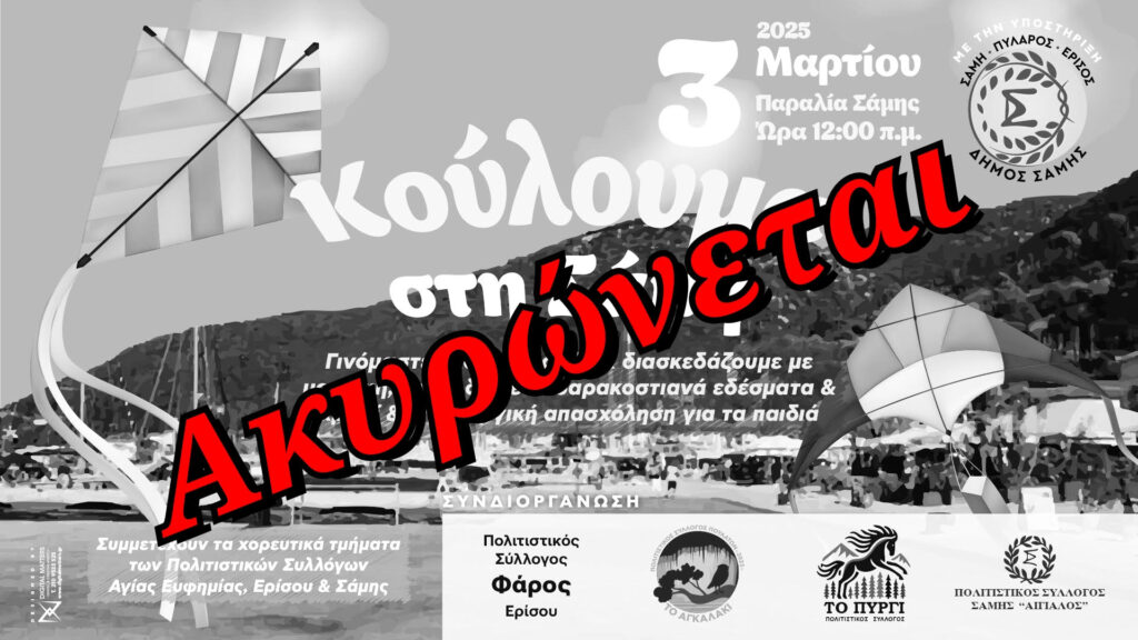Οι Πολιτιστικοί Σύλλογοι «Φάρος Ερίσου», Πουλάτων «Το Αγκαλάκι», Πυργιού «Το Πυργί» και Σάμης «ο Αιγιαλός» ως ένδειξη συμπαράστασης στο πένθος της οικογένειας του Νίκου Τρωιάνου που τόσο άδοξα έχασε την ζωή του σήμερα στη Σάμη, βρίσκονται στη δυσάρεστη θέση να ανακοινώσουν την ακύρωση των αυριανών εκδηλώσεων για την Καθαρά Δευτέρα.