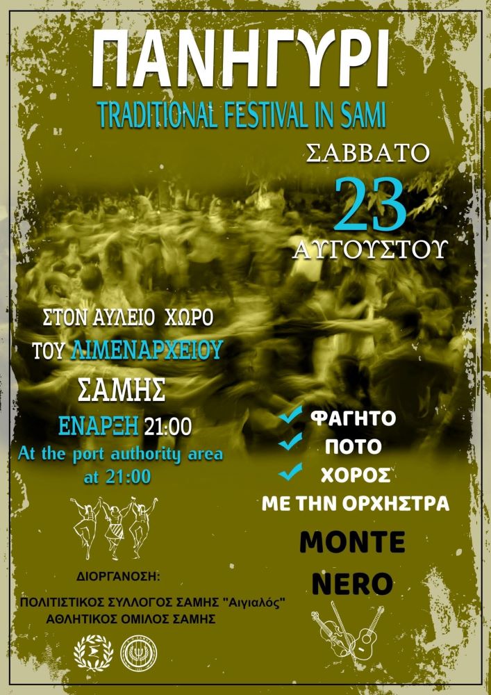 - Μετά το πέρας της Λιτανείας θα ακολουθήσει παραδοσιακό πανηγύρι στο λιμεναρχείο Σάμης από τον Πολιτιστικό Σύλλογο Σάμης «Ο Αιγιαλός» και τον Α.Ο. Σάμης.