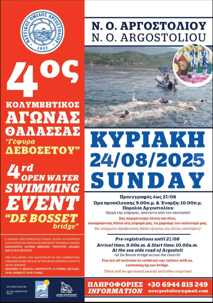 Ο Ναυτικός Όμιλος Αργοστολίου διοργανώνει για 4η συνεχή χρονιά τον Κολυμβητικό Αγώνα Θάλασσας “ΓΕΦΥΡΑ ΔΕΒΟΣΕΤΟΥ 2025” ,σε συνεργασία με την Περιφερειακή Ενότητα Κεφαλληνίας και το Δήμο Αργοστολίου. Ο αγώνας θα λάβει μέρος την Κυριακή 24 Αυγούστου 2025 με έναρξη στις 10.00 δίπλα από τη Γέφυρα και απέναντι από την εκκλησία Σισιώτισσα στην παραλία Αργοστολίου.