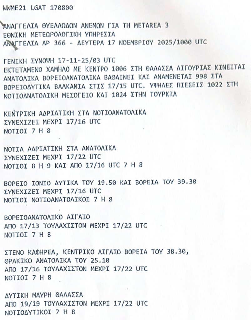 Ε.Μ.Υ. 17-11-2025/1000 UTC A.A.366/2025, που αφορά θαλάσσια περιοχή δικαιοδοσίας μας και